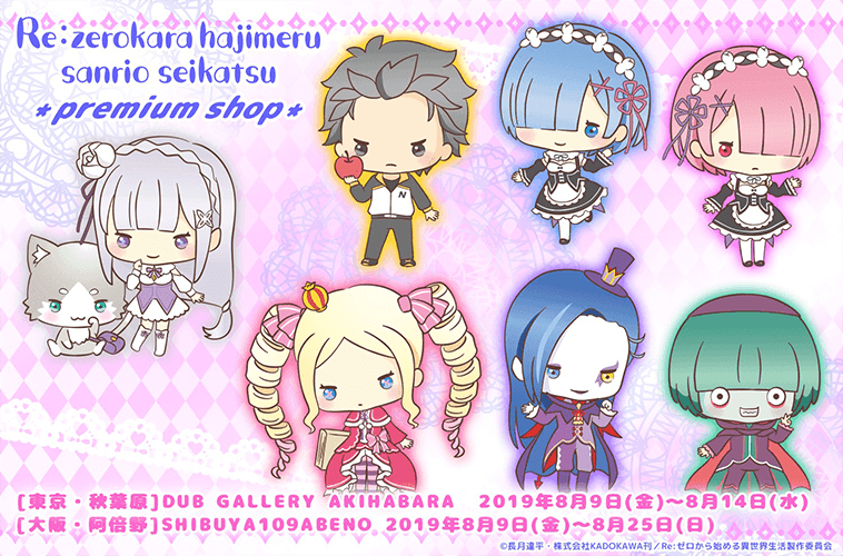 『Re:ゼロから始める異世界生活』の登場キャラクターをサンリオが可愛くデザインプロデュースした『Re:ゼロから始めるサンリオ生活』のショップが期間限定でオープンすることが決定しました! スバル、エミリア、パック、レム、ラム、ベアトリス、ロズワール、ペテルギウスの可愛いイラストを使用したアイテムを多数ご用意しています。 8月9日から東京・秋葉原、大阪・阿倍野で開催しますので、ぜひショップにお越しください。