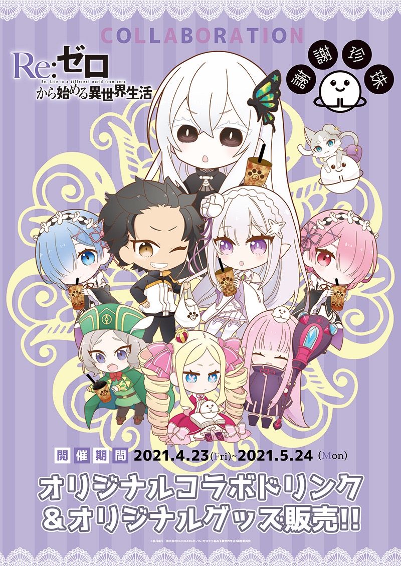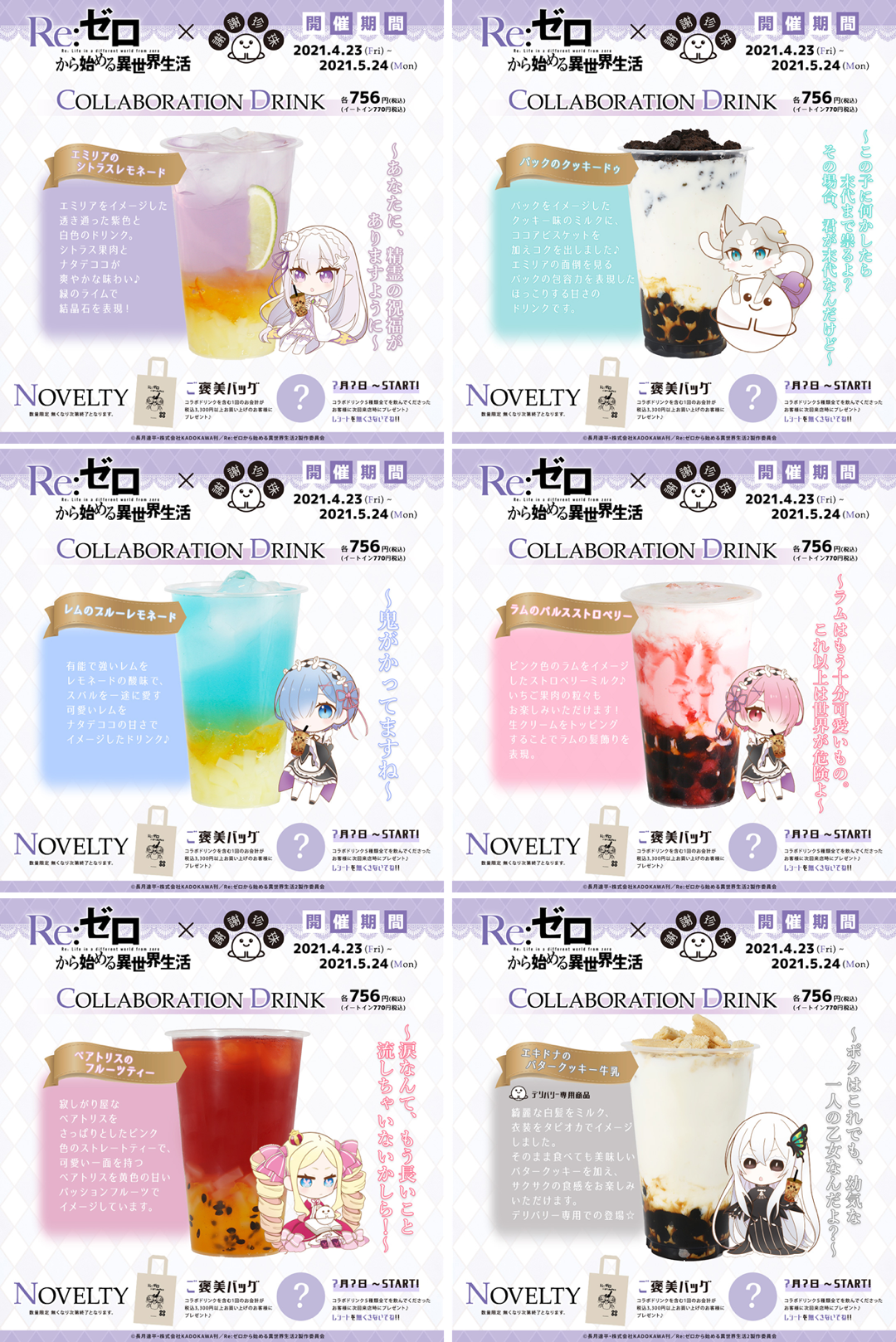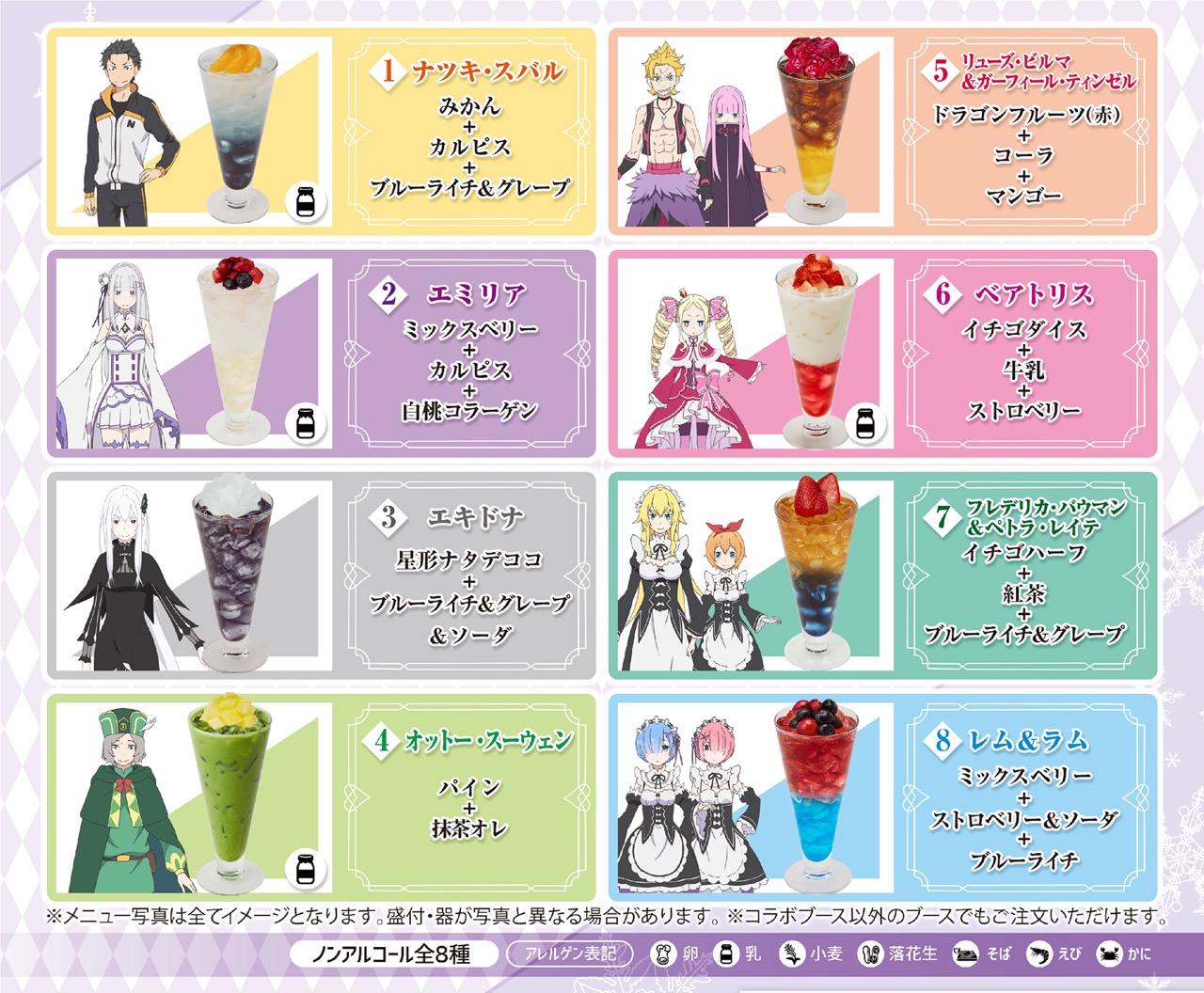 『Re:ゼロから始める異世界生活』の登場キャラクターをイメージした「ナツキ・スバル」「エミリア」「エキドナ」「オットー・スーウェン」「リューズ・ビルマ&ガーフィール・ティンゼル」「ベアトリス」「フレデリカ・バウマン&ペトラ・レイテ」「レム&ラム」の8種[各750円(税込)ノンアルコール]をご用意。