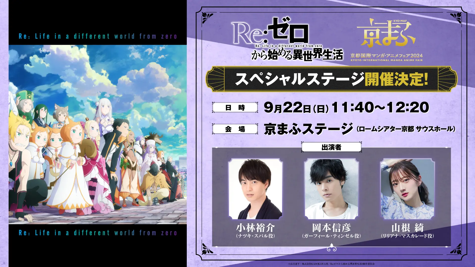 9月21日(土)、22日(日)に京都で実施される「京都国際漫画・アニメフェア 2024」(京まふ)にて、『Re:ゼロから始める異世界生活』3rd seasonの放送直前ステージの実施が決定しました。 お越しいただく方はぜひお立ち寄りください!