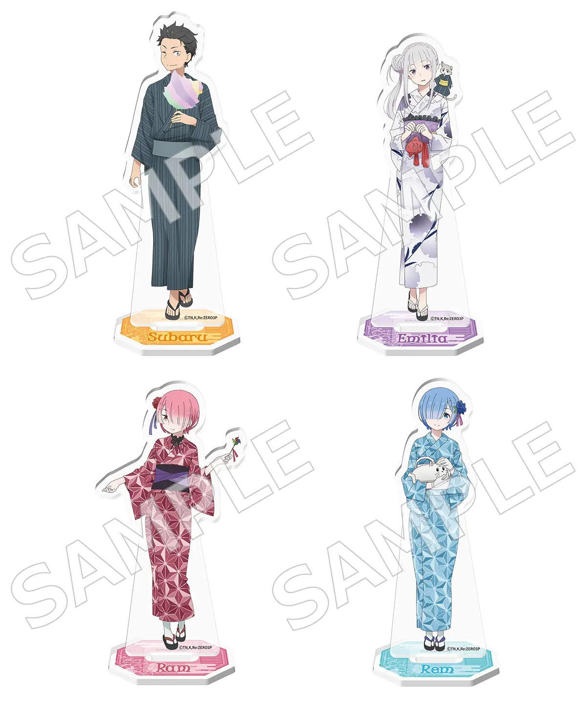TVアニメ『Re:ゼロから始める異世界生活』より、浴衣姿がとっても可愛い描き下ろしイラストを使用した、アクリルスタンドフィギュアが登場! サイズ: [本体]スバル 約H150mm×W50mm/エミリア 約H140mm×W47mm/ラム 約H131mm×W72mm/レム 約H133mm×W46mm [台座]共通 約H40mm×W60mm 材質:アクリル樹脂