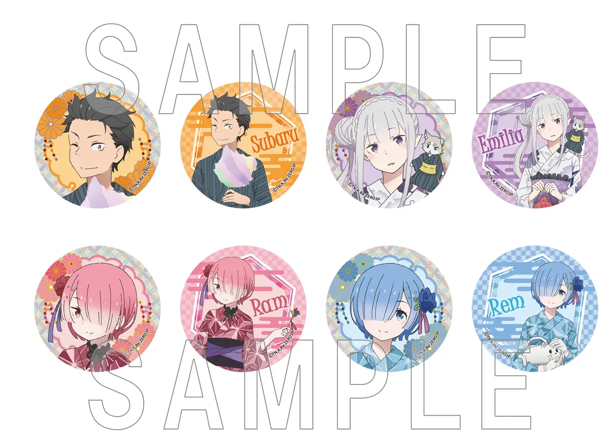 TVアニメ『Re:ゼロから始める異世界生活』より、浴衣姿がとっても可愛い描き下ろしイラストを使用した、きらきら仕様の直径約56mmの缶バッジが登場! ※全8種(ランダム商品のため、絵柄はお選びいただけません) 種類数:全8種(※ランダム商品のため、絵柄はお選びいただけません。) サイズ:直径約56mm 材質:紙、鉄、PET