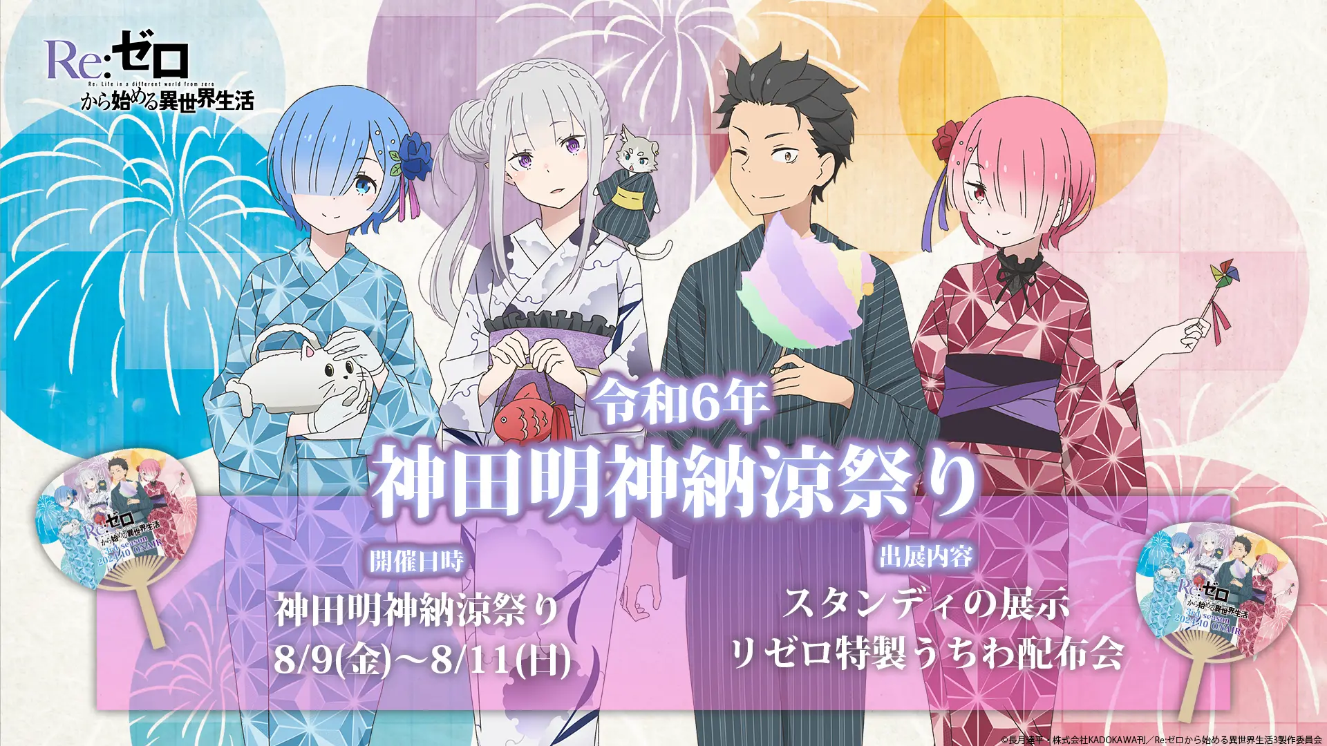 8月9日〜11日 に開催される「神田明神納涼祭り」にてTVアニメ『Re:ゼロから始める異世界⽣活』の出展が決定! テントにてエミリア、スバル、ラム、レムのスタンディの設置や特製うちわを配布いたします。
