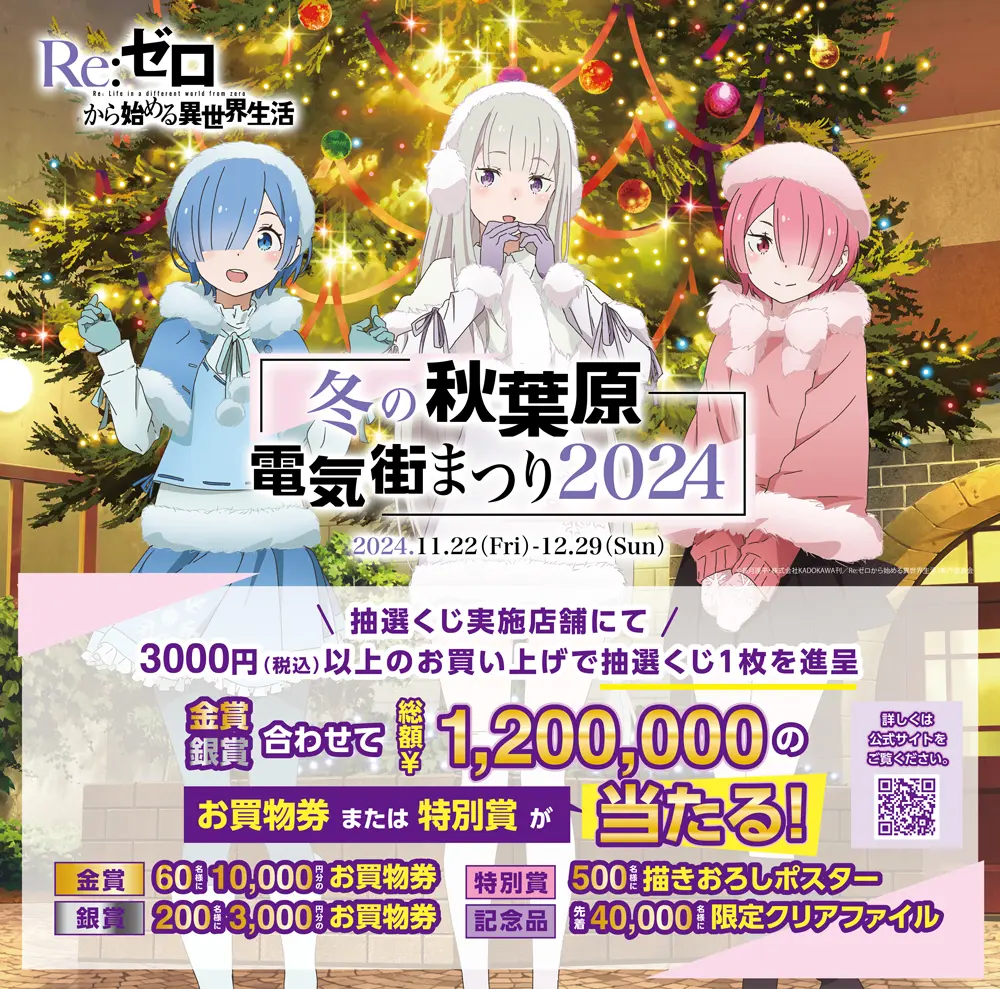 11月22日(金)より開催の「冬の秋葉原電気街まつり 2024」とのコラボが決定! 対象店舗にて3,000円以上お買い上げの方に抽選くじを進呈。総額120万円の お買い物券や特別賞(描きおろしポスター)などが当たるキャンペーンが開催されますので 是非ご参加ください。