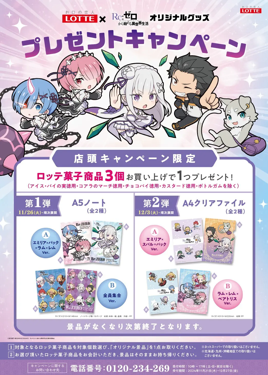 11月26日(火)より、全国の総合スーパー「イオン」(北海道・九州・沖縄を除く)にて、TVアニメ『Re:ゼロから始める異世界生活』 のオリジナルグッズが貰えるプレゼントキャンペーンの実施が決定!ロッテのお菓子を購入してオリジナルグッズを集めよう!