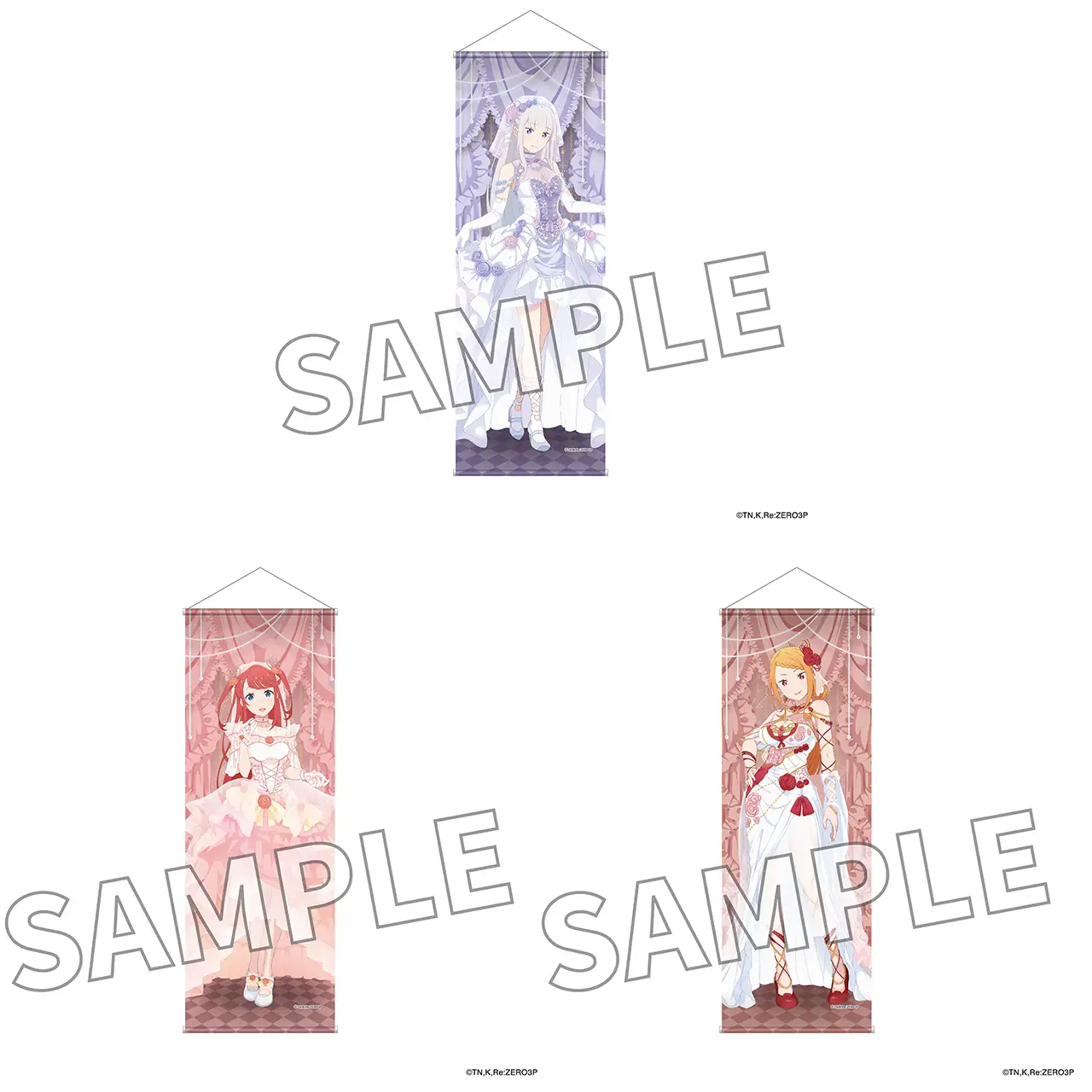 TVアニメ『Re:ゼロから始める異世界生活』より、描き下ろしイラストを使用した、ウェディング衣装がかわいいタペストリーが登場!(全3種) 【価格】 各2,200円(税込) 【仕様】 サイズ:約H715mm×W257mm程度 材質:(生地)ポリエステル100%、(紐)ナイロン、(棒)PVC