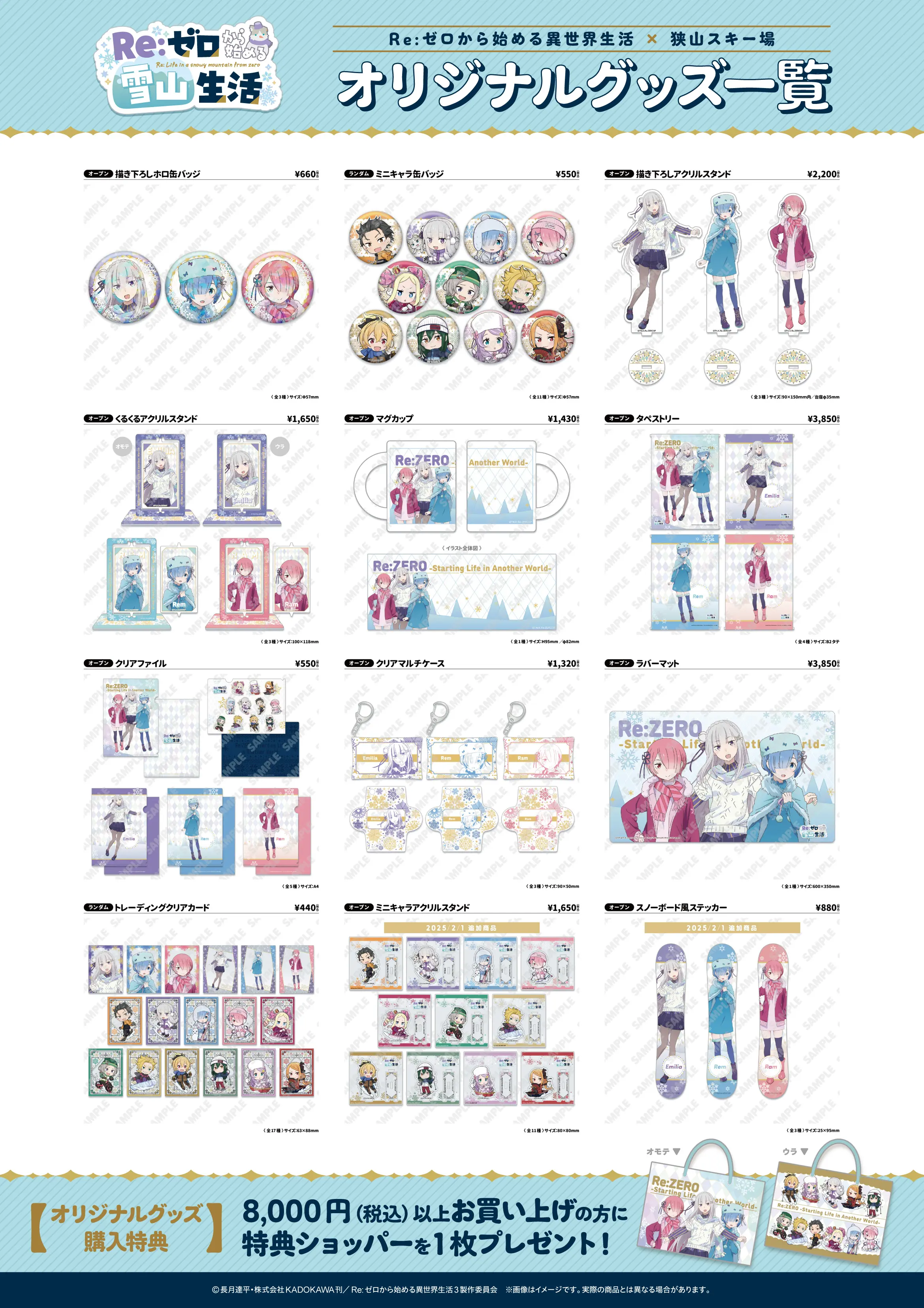2025年1月15日(月)より狭山スキー場とのコラボイベントが開催決定! 冬らしい衣装に身を包んだエミリア、レム、ラムの描き下ろしイラストに加え、雪山を楽しむ姿のミニキャライラストも登場! オリジナルグッズの販売や、コラボフード、縁日コーナー、狭山スキー場を巡る謎解きラリーに加え、“何度も滑る”雪山チャレンジなど、楽しい企画が盛りだくさん!