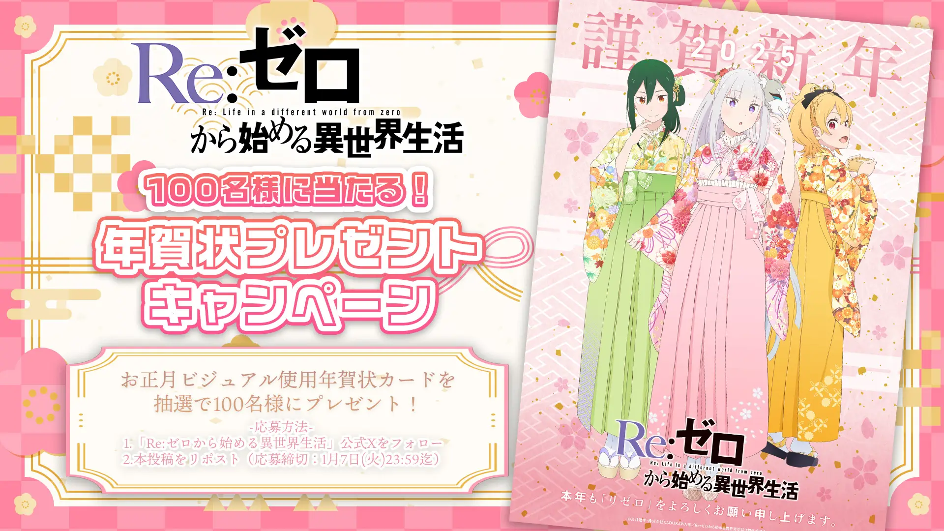 お正月ビジュアルの公開を記念し、TVアニメ「Re:ゼロから始める異世界生活」公式X(Twitter)をフォロー・対象投稿をリポストしていただいた方の中から抽選で100名さま年賀状風カードをプレゼントするキャンペーンを開催!