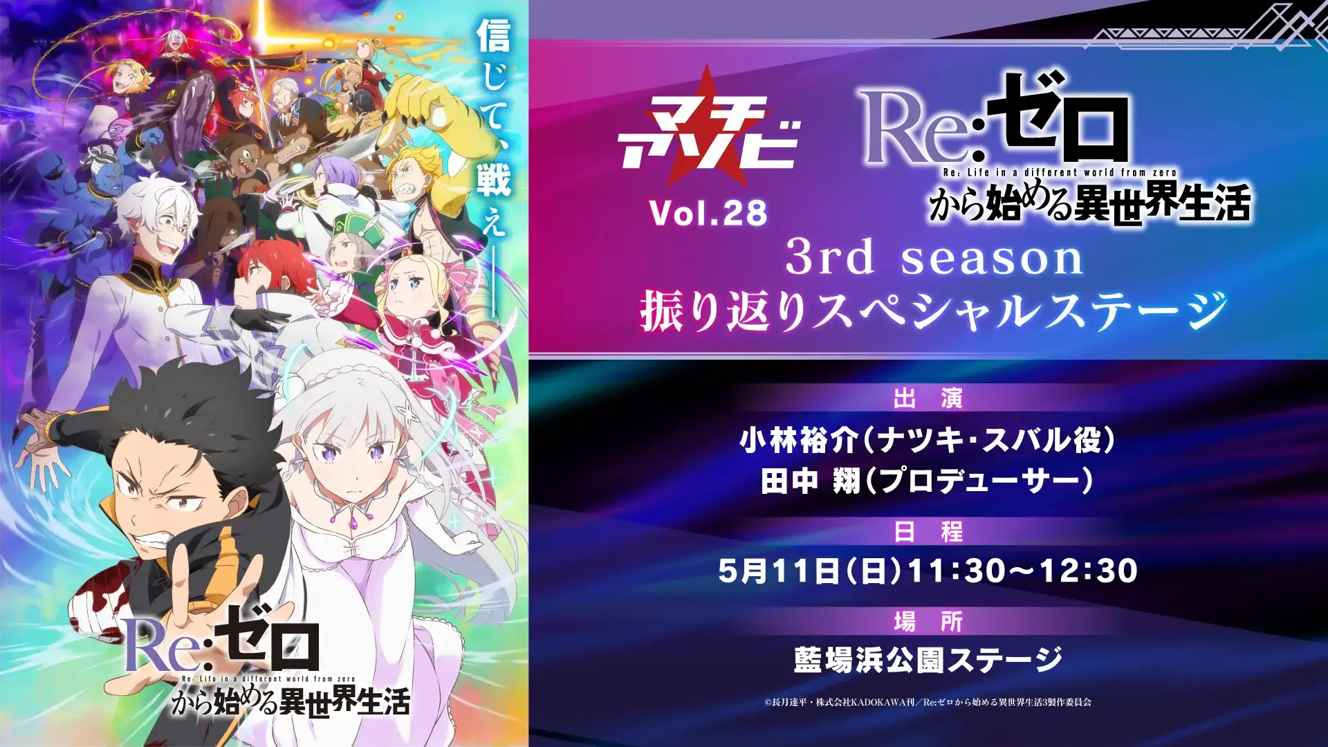 5/10~11徳島県にて開催される「マチ★アソビ Vol.28」にて、TVアニメ『Re:ゼロから始める異世界生活』3rd season振り返りスペシャルステージの開催が決定。 さらに、同日にはキャスト&スタッフおすすめの話数を無料でご覧いただけるセレクション上映も開催予定です。ぜひ皆様お越しください!