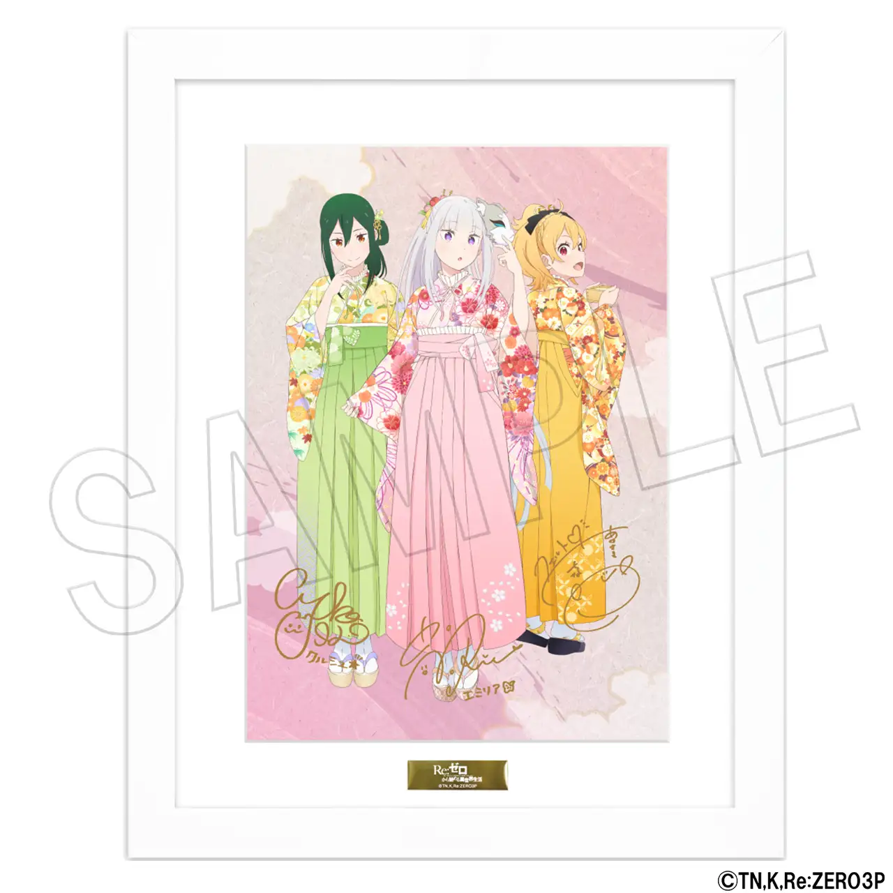 TVアニメ『Re:ゼロから始める異世界生活』より和服装が可愛い複製原画が登場! 高橋李依さん(エミリア役)、赤﨑千夏さん(フェルト役)、井口裕香さん(クルシュ役)の複製サインが入った豪華な複製原画です! 【価格】 16,500円(税込) 【仕様】 サイズ:(画部分)約H297mm×W210mm (額装)約H403mm×W316mm 材質: [額縁]樹脂製 [マット紙・イラスト]紙 [面材]アクリル樹脂 [裏板]合板
