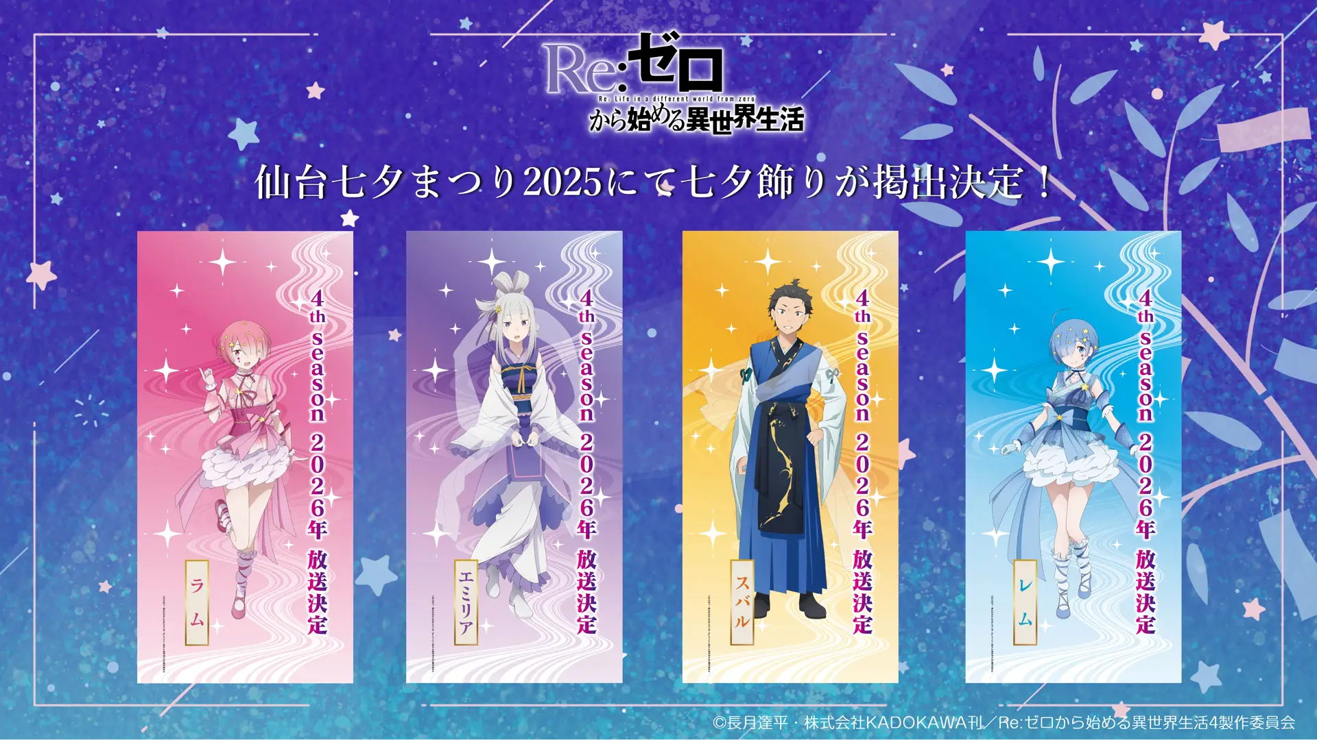 本日、七夕ビジュアルを公開しました! さらに、2025年8月5日(月)前夜祭~8月8日(木)に開催される「仙台七夕まつり2025」にて、『Re:ゼロから始める異世界生活』のオリジナル七夕飾りを掲出することが決定!また、仙台駅東西自由通路では本日公開したビジュアルの新作グッズの先行販売を実施いたします。 スバルやエミリアたちといっしょに七夕まつりを楽しみましょう!