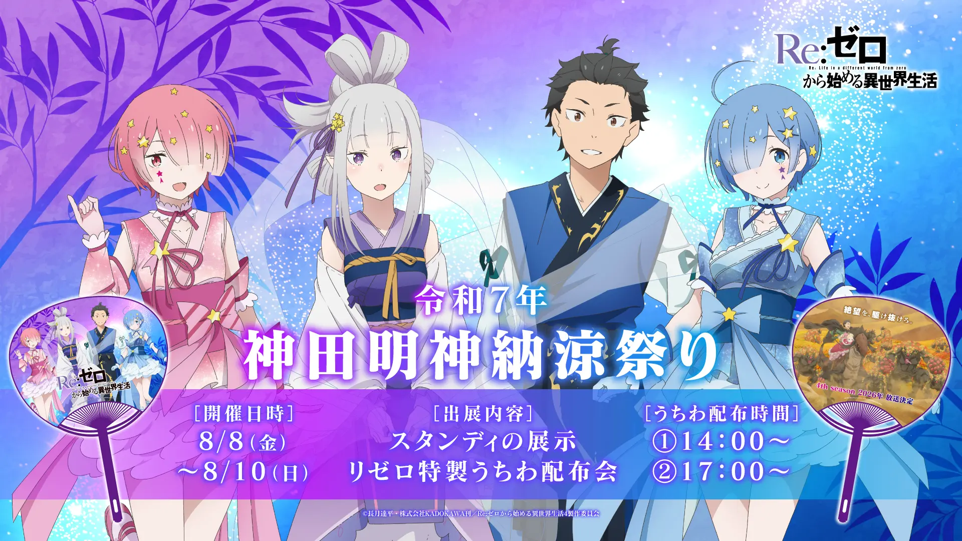 https://bushiroad-creative.com/topics/88917/8月8日〜10日 に開催される「神田明神納涼祭り」にてTVアニメ『Re:ゼロから始める異世界⽣活』の出展が決定いたしました! 会場ではスバル、エミリア、ラム、レムのスタンディの設置や特製うちわを配布いたします。
