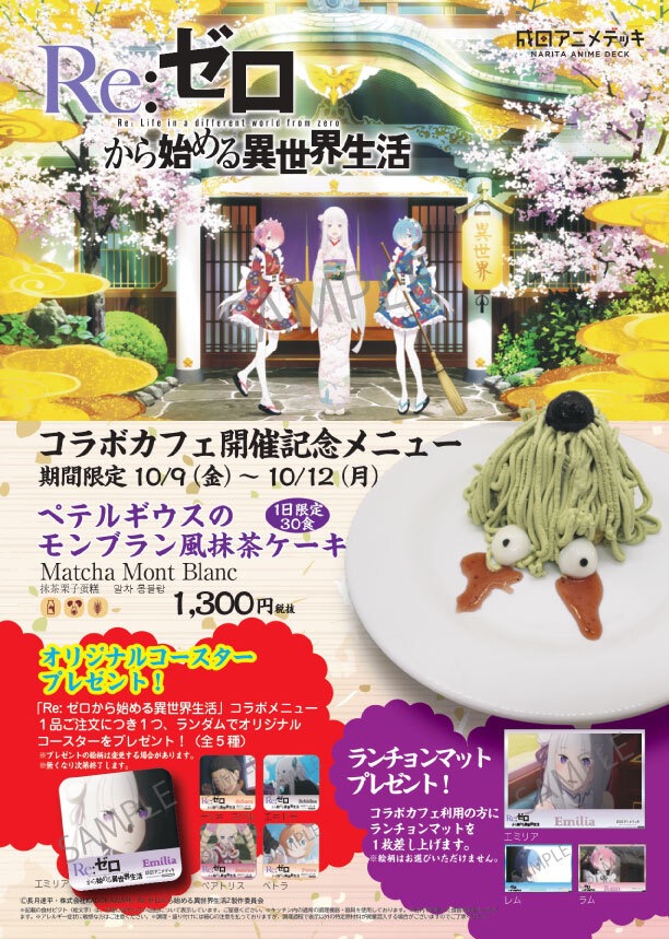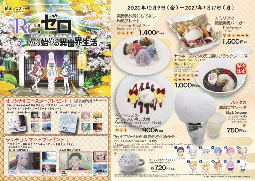 | ノベルティ | ・ランチョンマット カフェのご利用の方にランダムでプレゼント。 第1弾:10月9日(金)~ エミリア、レム、ラム 第2弾:11月27日(金)~ ナツキ・スバル、ベアトリス、エキドナ ・オリジナルコースター コラボメニュー1品ご注文につき1つ、ランダムでプレゼント。 第1弾:10月9日(金)~ ナツキ・スバル、エミリア、ベアトリス、ペトラ、エキドナ 第2弾:11月27日(金)~ レム、ラム、ガーフィール、フレデリカ、リューズ |