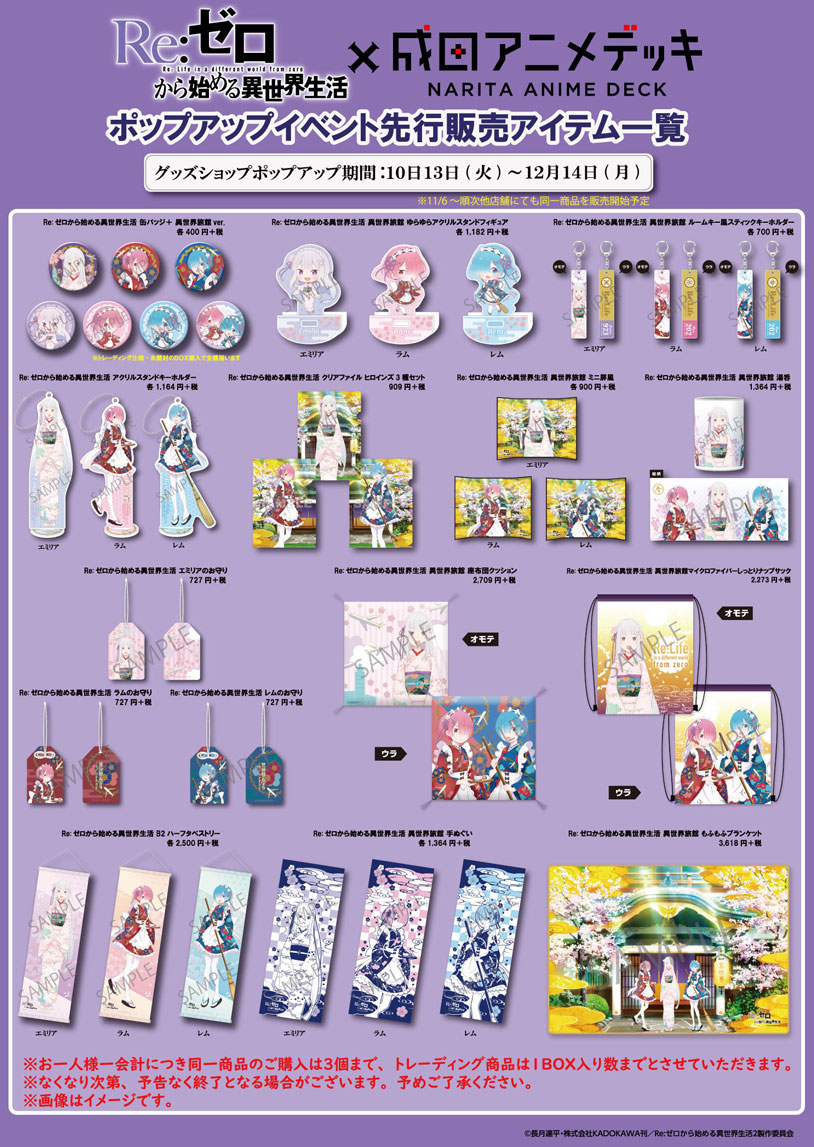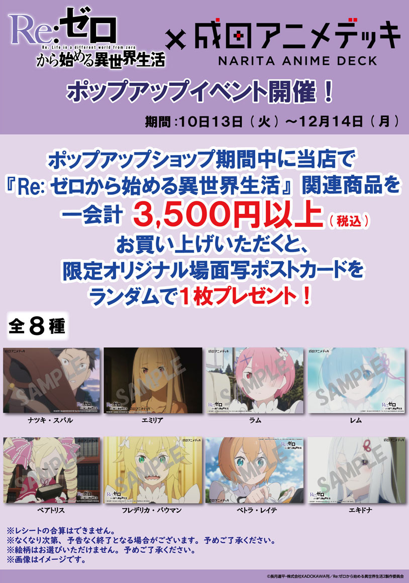 | ノベルティ | ポップアップ期間中に成田アニメデッキグッズショップにて『Re:ゼロから始める異世界生活』関連商品を一会計3,500円以上(税込)お買い上げのお客様に、限定ポストカードをランダムで1枚プレゼントします。 ※レシートの合算はできません。 ※ノベルティは無くなり次第終了となります。 |