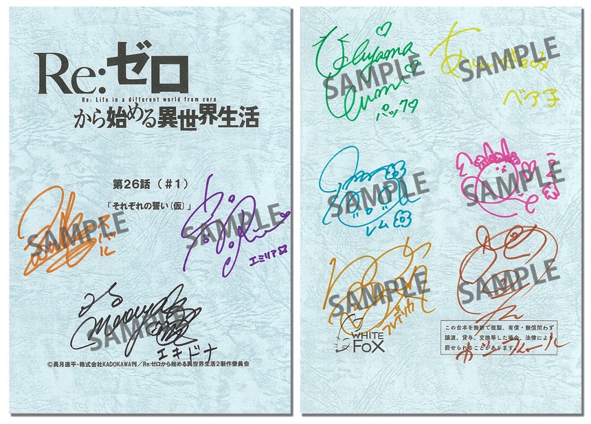 『Re:ゼロから始める異世界生活』2nd seasonのBlu-ray&DVD 第1巻を対象店舗にてご予約・ご購入頂いた方の中から抽選で、キャストの直筆サイン入り台本をプレゼントいたします。ぜひ、ご予約ください。
