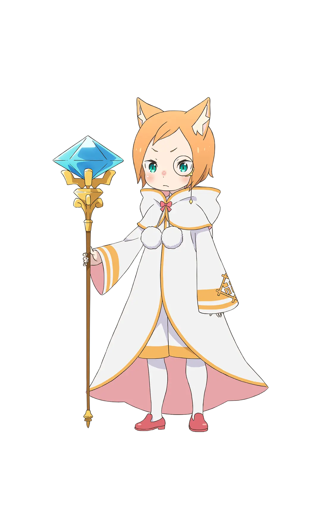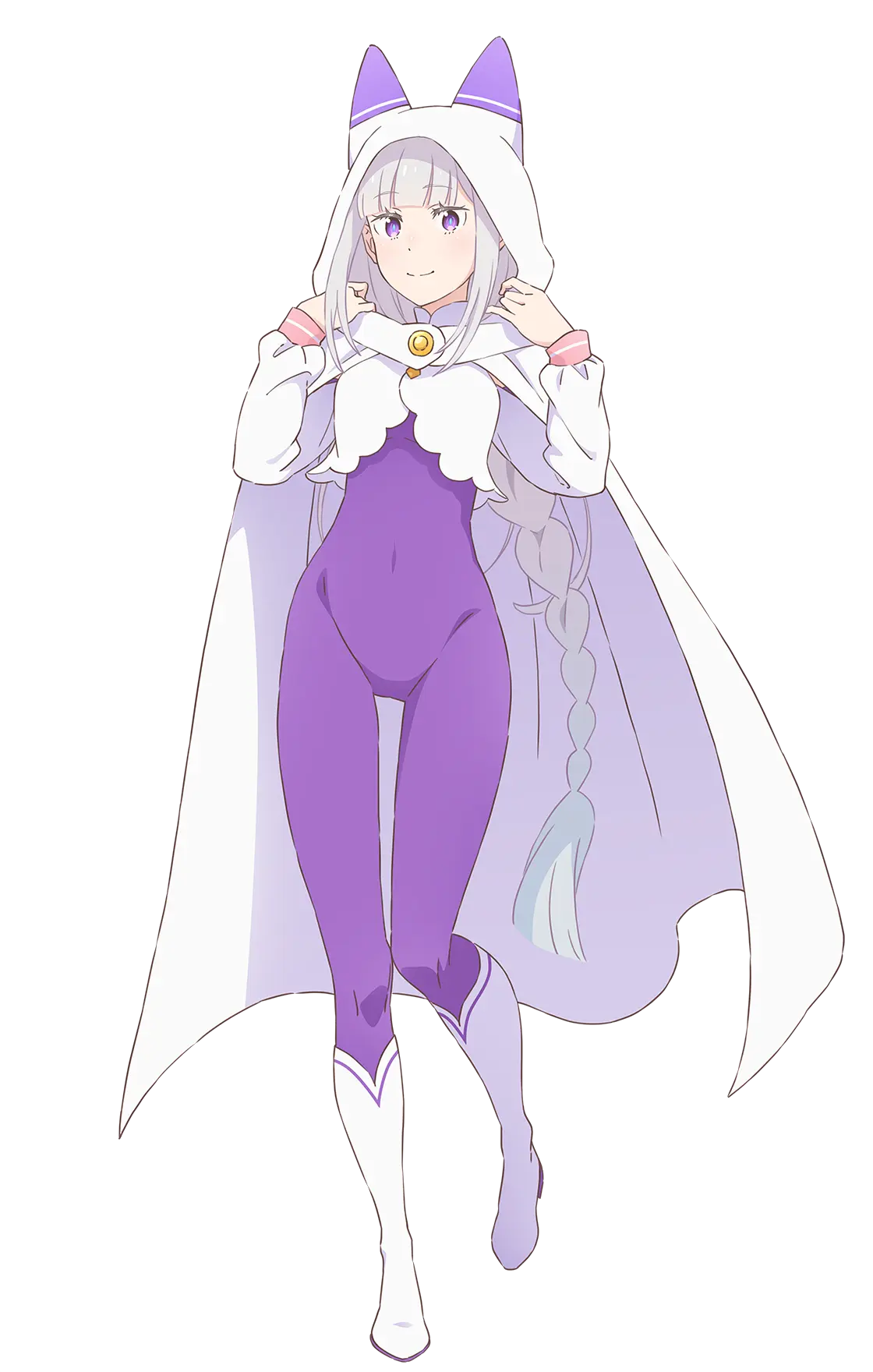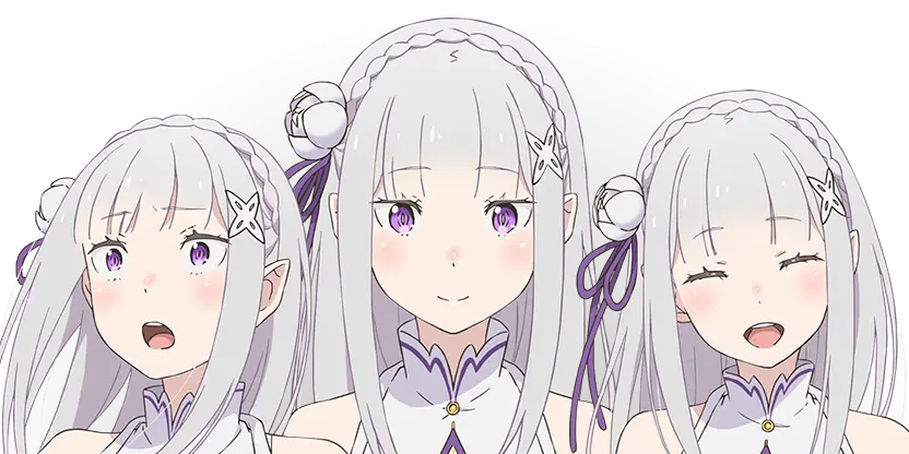 かつて世界を滅ぼしかけた『嫉妬の魔女』と同じ、銀髪に紫紺の瞳を持つ美しいハーフエルフの少女。お人好しで面倒見の良い性格だが、当人はなぜかそれを素直に認めようとしない。小さな猫の姿をした精霊のパックをお供に連れている。 ルグニカ王国の次代の王を決める王選の候補者の一人。