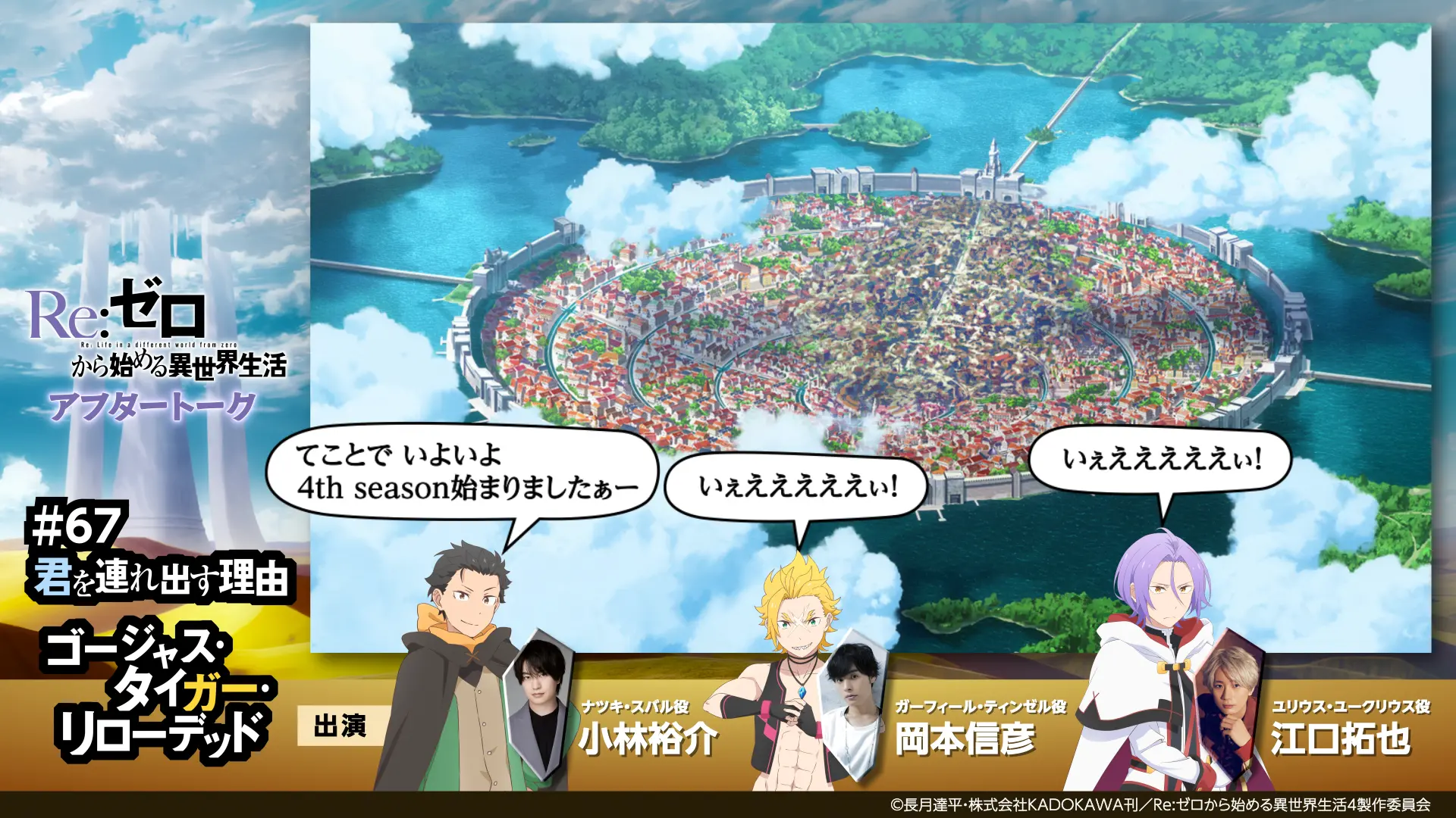 その後、4th seasonの1話にあたる第67話のあらすじと先行カットが公開されます。第67話の見どころについて、江口さんは「やっぱりゴージャスタイガー・リローデッド。グッとくるポイントがある」とコメント。新井さんも深く頷きながら、「涙なしには見られない」と、共感していました。 また、演じるシャウラについてファイルーズさんは、あまりにも“お馬鹿っぽい”言動が多いため、そういえば『賢者』だったと思い出すことが多いと語りつつ「そんなギャップがいい」とアピール。小林さんも「重い空気になることが多い『リゼロ』で清涼剤になる存在」と続けて、ファイルーズさんは最終的に「おもしれー女です!」とまとめました。 また、ユリウスについて江口さんは「今期を通して、僕自身もユリウスを理解していっている」とコメント。他の登壇者も江口さんに共感しながら、「これまで完璧な存在に見えていた彼の印象が大きく変わるかも」と言葉にしました。 また毎回恒例となっているミニアニメの放送決定も発表。ミニアニメについて高橋さんは「本編を見るうえでも重要だなと思うことがたくさんあるので是非本編と一緒に楽しんでほしい」と、多くは語らずとも、内容の重要度について触れていました。